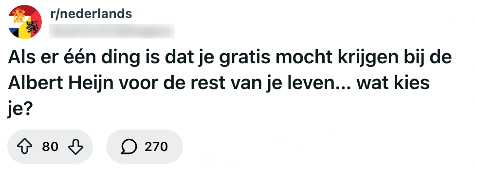 Je hoeft maar even naar een gesprek op een kringverjaardag te luisteren of op je bankrekening te kijken en het is gelijk duidelijk: boodschappen zijn duur. Elke keer dat jij je pinpas moet trekken voor de weekboodschappen springen de tranen in je ogen door het totaalbedrag en beloof je jezelf dat je volgende week meer op aanbiedingen gaat letten. Maar wat als je dat niet zou hoeven doen? Albert Heijn-klanten discussiëren online over welk product zij het liefst voor altijd gratis zouden krijgen en de keuzes lopen flink uiteen.