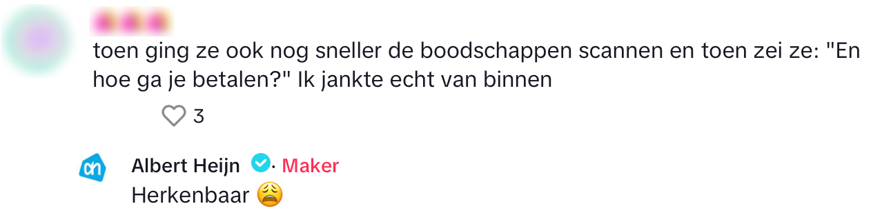 Albert Heijn heeft keer op keer bewezen een kei te zijn in hun webcare, maar dat is duidelijk niet het enige waar ze in uitblinken. Ze kennen hun klanten namelijk als geen ander en weten precies wat er in hun winkel gebeurt. Dat laten ze ook maar weer blijken op hun TikTok-kanaal in een aantal superherkenbare video’s over situaties in de supermarkt.