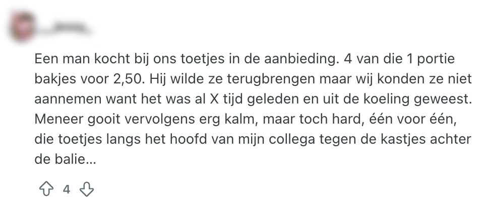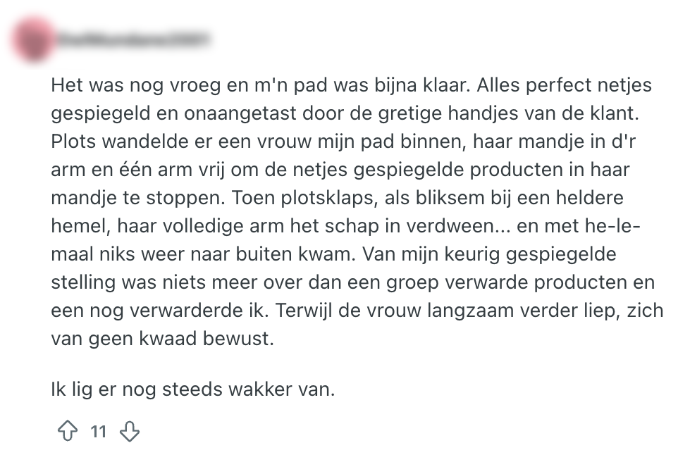 Als supermarktmedewerker heb je iedere shift met ontzettend veel mensen te maken, die allemaal zo hun eigenaardigheden hebben. Denk aan de vrachtwagenchauffeur met een ochtendhumeur van hier tot Tokio, collega’s die elk vak verkeerd weten te vullen en klanten die blijven klagen bij de servicebalie tot ze een ons wegen. Het zal je dan ook niet verbazen dat het personeel van de supermarkt genoeg meemaakt. Albert Heijn-werknemers delen via Reddit hun onvergetelijke ervaringen op de werkvloer en bewijzen daarmee wederom dat hun baan een vak apart is.