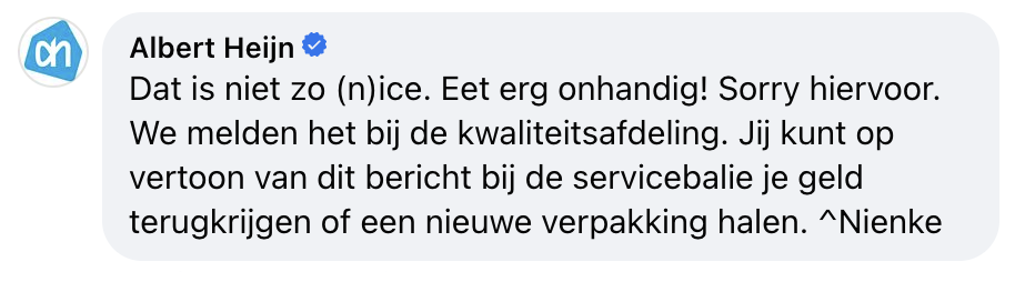 Wat verwacht je als je een voorverpakt ijsje van de supermarkt uit de doos haalt? Waarschijnlijk een wikkel, een hoorntje en het ijs zelf. Willem krijgt één van deze dingen echter niet – en je kan je ongetwijfeld voorstellen dat dat voor een onhandige eetervaring zorgt. De klant deelt zijn opmerkelijke ijsje op Facebook en gelukkig is Albert Heijn niet vies van een goede woordspeling.