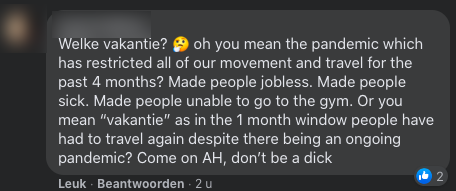 Waar Albert Heijn in 2017 nog The Best Social Award voor Beste Webcare in ontvangst nam, hebben de comments onder de posts op Facebook en Instagram geen reacties gekregen van Albert Heijn. Zonde! Want dat ze kunnen reageren op klachten zie je hier. We vroegen hen daarom via een DM om een reactie. Daarop kregen we het volgende antwoord: