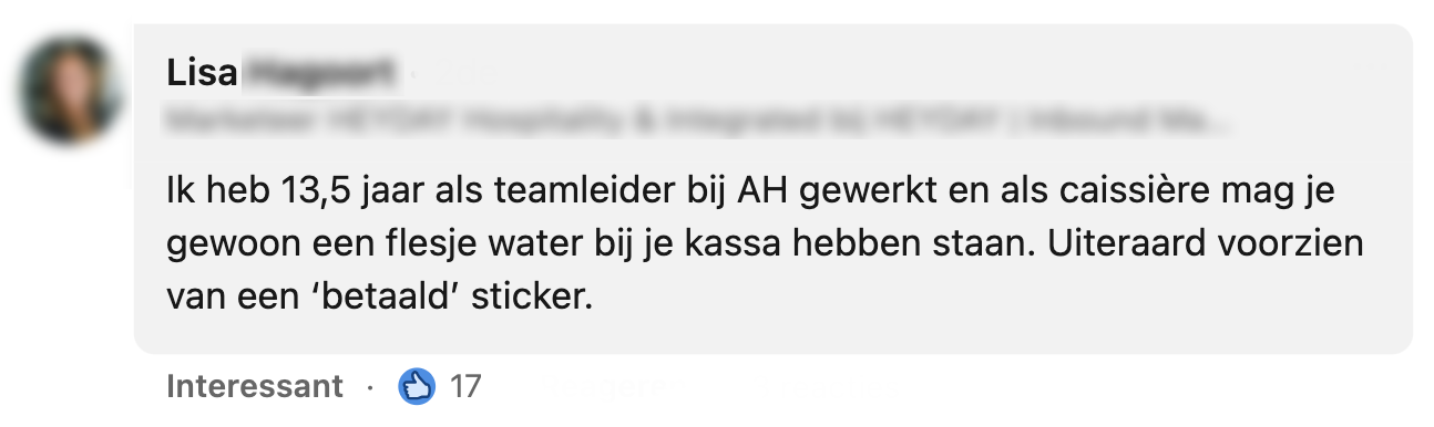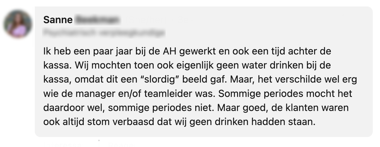 Met dit warme weer is het voor iedereen belangrijk om genoeg water te drinken. Je zou dan ook denken dat supermarktmedewerkers prima een slokje kunnen nemen tussen het helpen van klanten door, maar in sommige winkels is niets minder waar. Zo mag de dochter van Adam, die bij Albert Heijn werkt als caissière, tijdens haar shift helemaal niets drinken. Haar vader vindt dit meer dan belachelijk en deelt zijn frustratie op LinkedIn. Meteen krijgt hij een hoop verontwaardigde reacties én een statement van Albert Heijn.