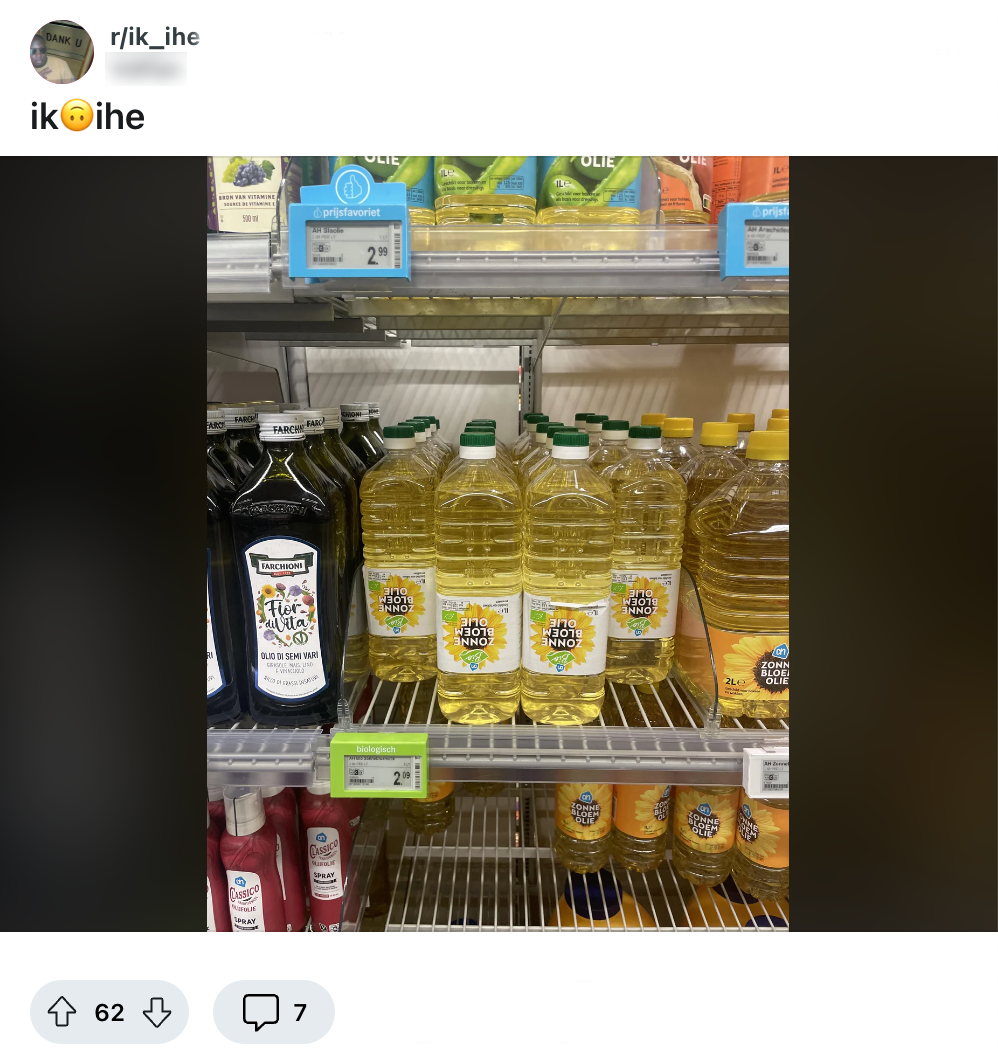 Ook al proberen supermarkten hun schappen er zo goed mogelijk uit te laten zien, gaat dat niet altijd goed. Denk bijvoorbeeld aan lege koffiebekertjes van andere klanten, gigantische stapels producten om restanten te voorkomen of beschimmelde producten die bijna oud genoeg zijn om zelf vakken te vullen. Ook in de fabrieken en distributiecentra gaat niet alles gesmeerd. Een Reddit-gebruiker ontdekt een bijzondere fout op de verpakking van de zonnebloemolie in de schappen van Albert Heijn en andere Nederlanders reageren met grappen van de bovenste plank.