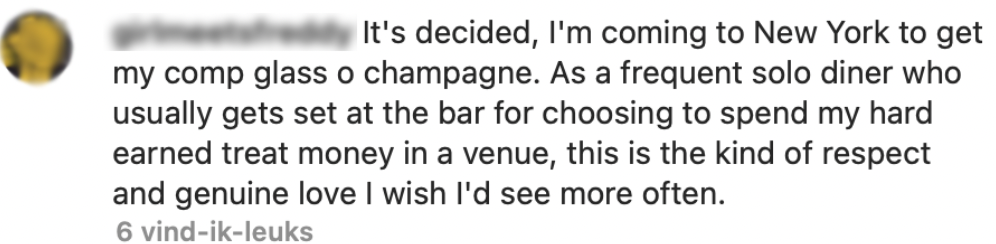 1. Het restaurant deelt regelmatig foto’s van bezoekers die alleen komen eten op Instagram. Werken met een gratis glas champagne erbij is zo gek nog niet.