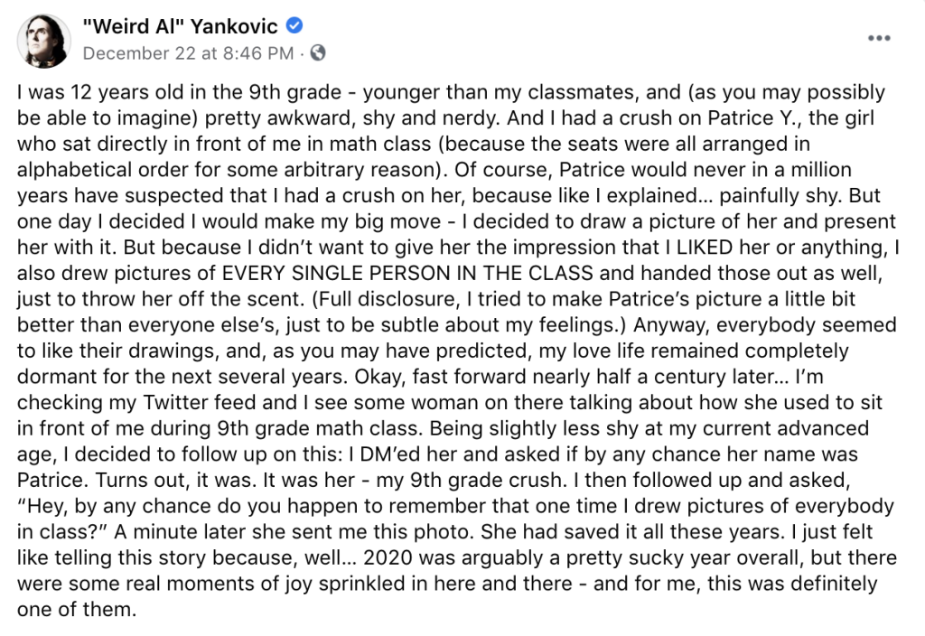 “Weird Al” Yankovic is een Amerikaans muzikant die vooral bekend staat om zijn parodieën van bekende nummers. Zoals zijn naam al doet vermoeden is hij een beetje een vreemde man, en dat was vroeger niet anders. Zo deelt hij op zijn Facebook dat hij op 12-jarige leeftijd een beetje buiten de boot viel. Als hij eindelijk de moed heeft verzameld om iets te geven aan het meisje op wie hij een oogje heeft, lijkt zijn actie helaas niet succesvol. Maar nu, bijna 50 jaar later, komt hij er op een bizarre manier achter dat hij toch veel meer indruk achter had gelaten dan hij dacht.