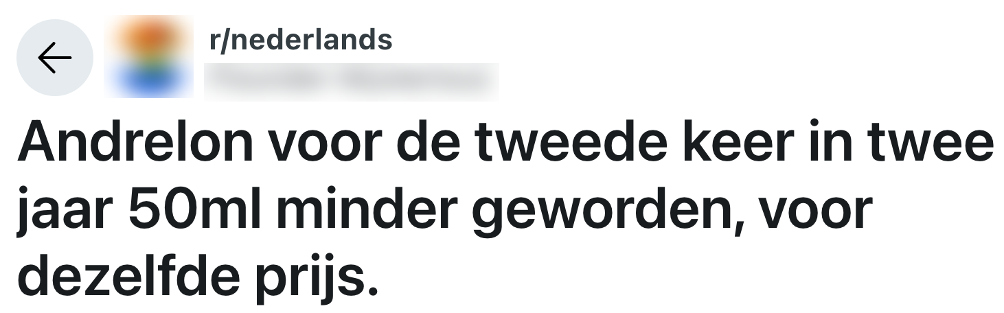 Het leven wordt steeds duurder. Waar je vroeger nog voor vijftig cent een huis op de kop kon tikken, moet je tegenwoordig minimaal twee nieren en je eerstgeboren kind afstaan voor een kartonnen doos ergens onder een brug. Dit geldt helaas niet alleen voor huizen, maar ook voor kleinere uitgaven als boodschappen en levensmiddelen. Zo doet een klant een ontdekking over de flessen Andrelon, die toch een beetje pijn doet aan de portemonnee.