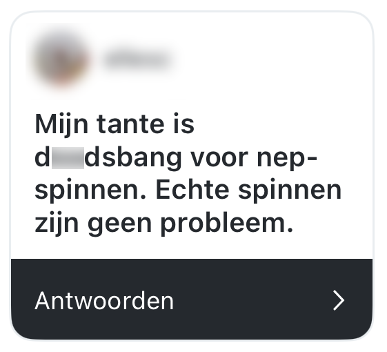 Waar de ene persoon terugdeinst voor hoogtes, kleine ruimtes, spinnen en achtbanen, roept de ander vol trots dat-ie nergens bang voor is. Maar eerlijk is eerlijk: zelfs de grootste helden krijgen wel ergens de kriebels van. Misschien van iets alledaags, misschien van iets waar je in eerste instantie niet aan denkt. We vroegen via Instagram naar de meest bijzondere angsten waarvan jullie ooit hebben gehoord en één ding is zeker: jullie waren niet bang om te reageren.