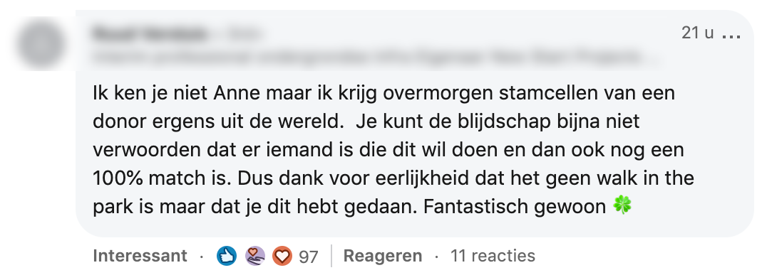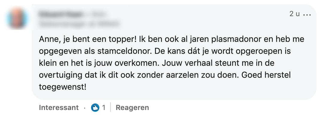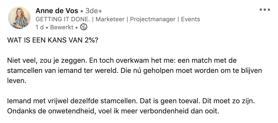 Meer dan 300.000 Nederlanders staan geregistreerd als stamceldonor. Toch is er maar een heel klein deel dat een match krijgt en daadwerkelijk kan doneren. Anne was een van die mensen. Ze vond het een heftig proces, maar ze heeft er geen seconde spijt van gehad. Ze deelt haar verhaal op LinkedIn.