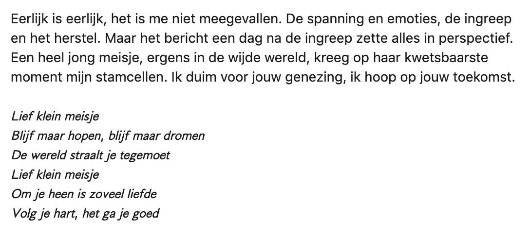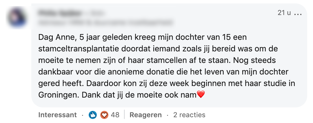 Meer dan 300.000 Nederlanders staan geregistreerd als stamceldonor. Toch is er maar een heel klein deel dat een match krijgt en daadwerkelijk kan doneren. Anne was een van die mensen. Ze vond het een heftig proces, maar ze heeft er geen seconde spijt van gehad. Ze deelt haar verhaal op LinkedIn.