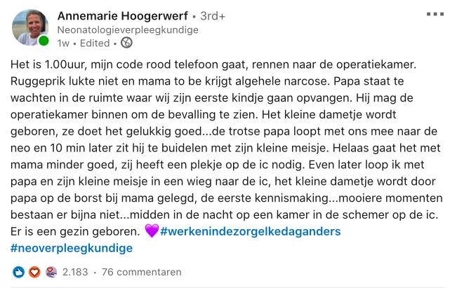 Werken in de zorg. Het is en blijft een heel speciaal beroep, dat kunnen we wel weer concluderen na het lezen van Annemarie’s bijzondere LinkedIn post. Ze deelt een ontroerend verhaal over de geboorte van een kindje, wat zeker niet zonder slag of stoot gaat. Het levert nog meer indrukwekkende verhalen op.