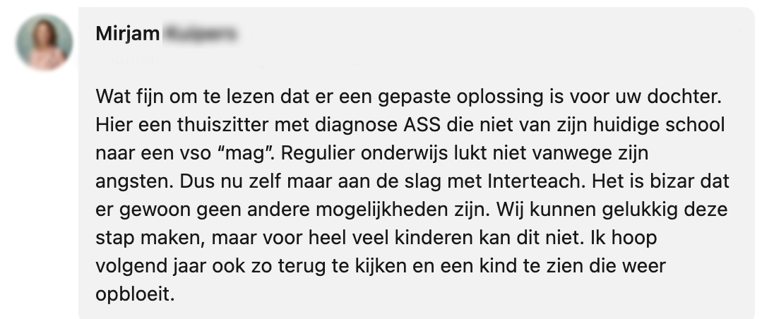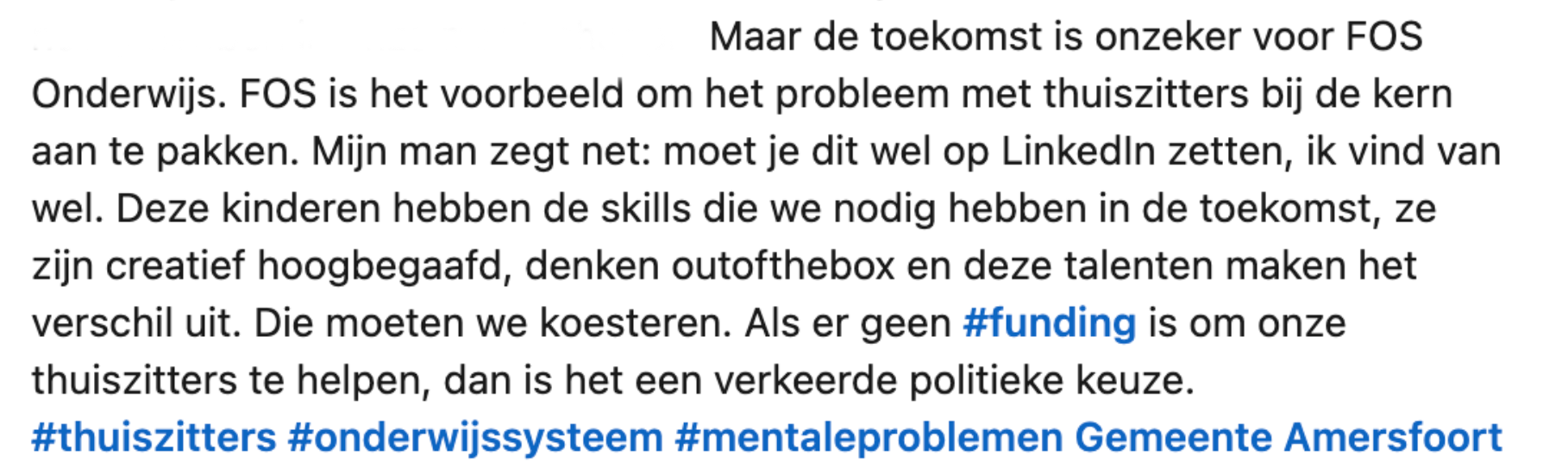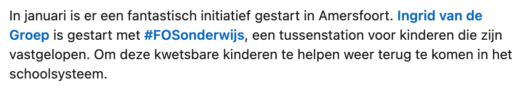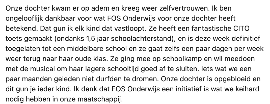 5. Maar helaas wordt FOS Onderwijs op dit moment te weinig gesteund. Daarom doet Annemiek in haar bericht een oproep om aandacht te vragen voor dit soort initiatieven.