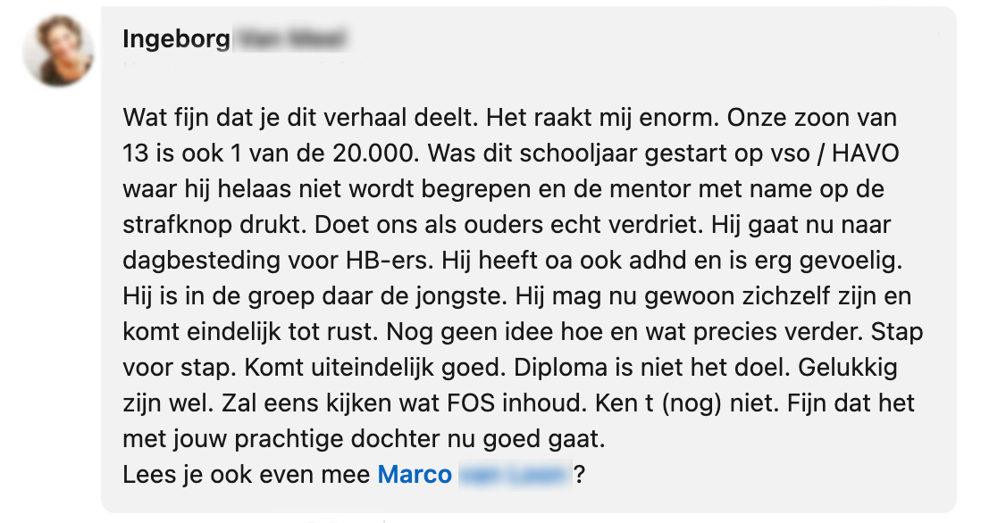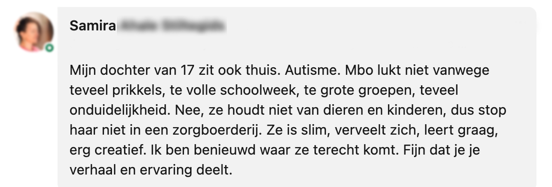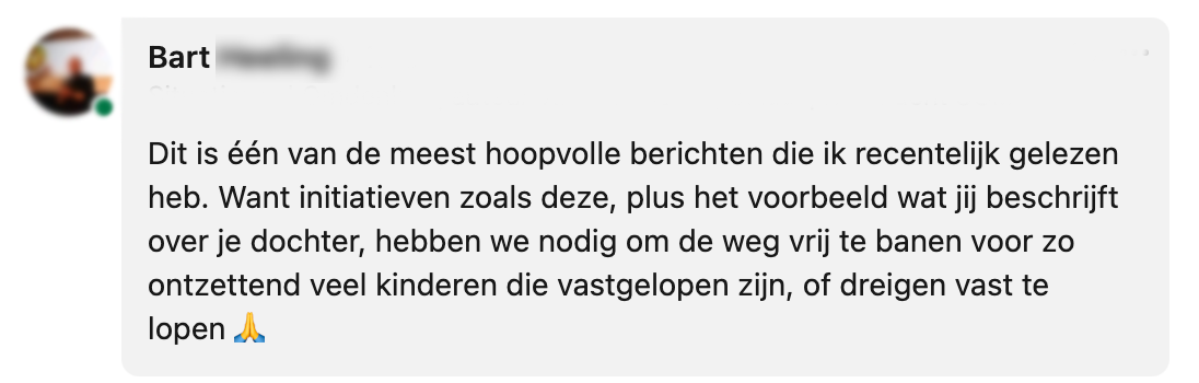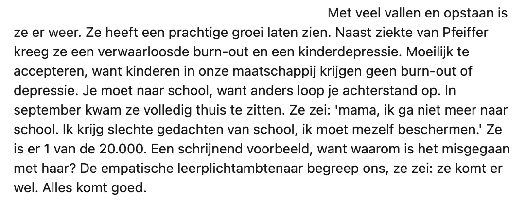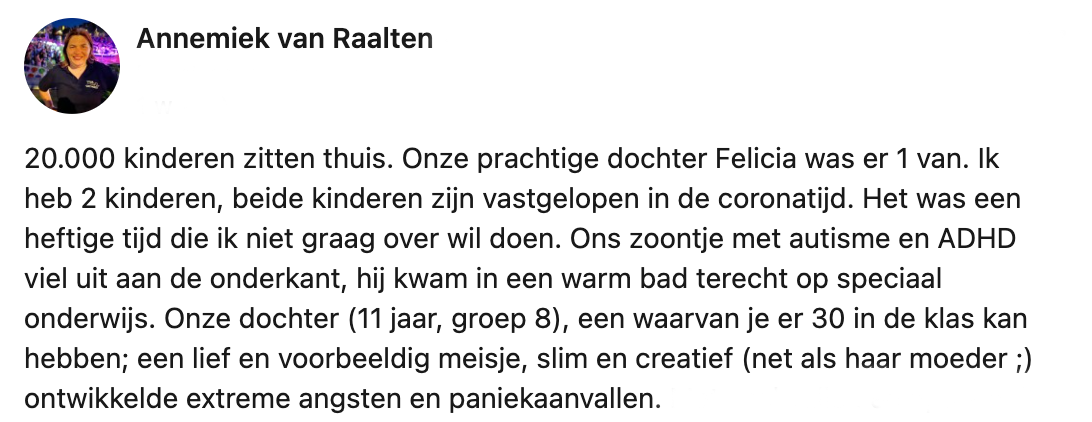 Toen Felicia, de 12-jarige dochter van Annemiek, na de eerste lockdown weer naar school ging, ontwikkelde zij veel angsten. Ze kwam in een verwaarloosde burn-out en depressie terecht, waardoor Felicia anderhalf jaar niet naar school kon. Na een maandenlange zoektocht naar een oplossing kwam Annemiek in contact met FOS Onderwijs, een onderwijssysteem voor kinderen die zijn vastgelopen. Inmiddels zit Felicia goed op haar plek, maar moet het initiatief waarschijnlijk haar deuren sluiten. Op LinkedIn deelt Annemiek het verhaal met een oproep om dit soort initiatieven te steunen.