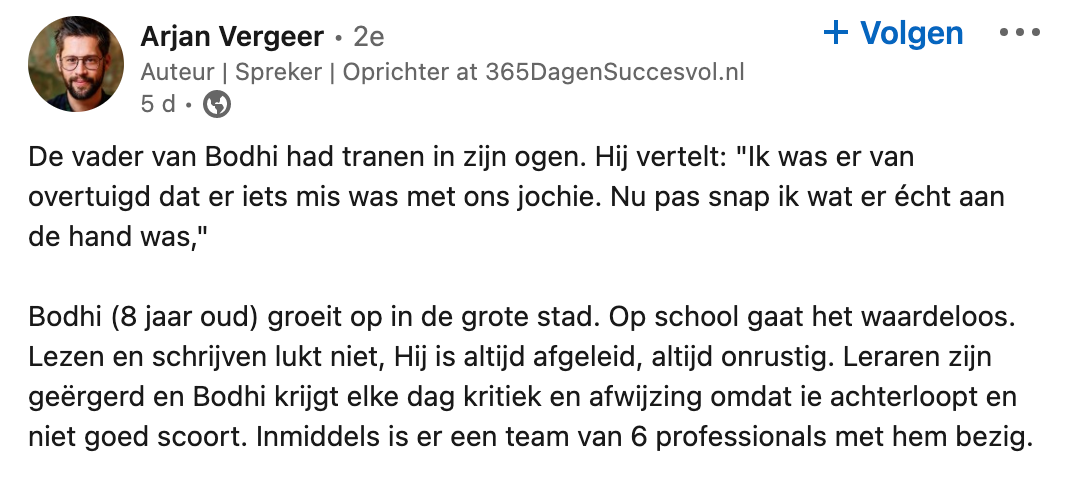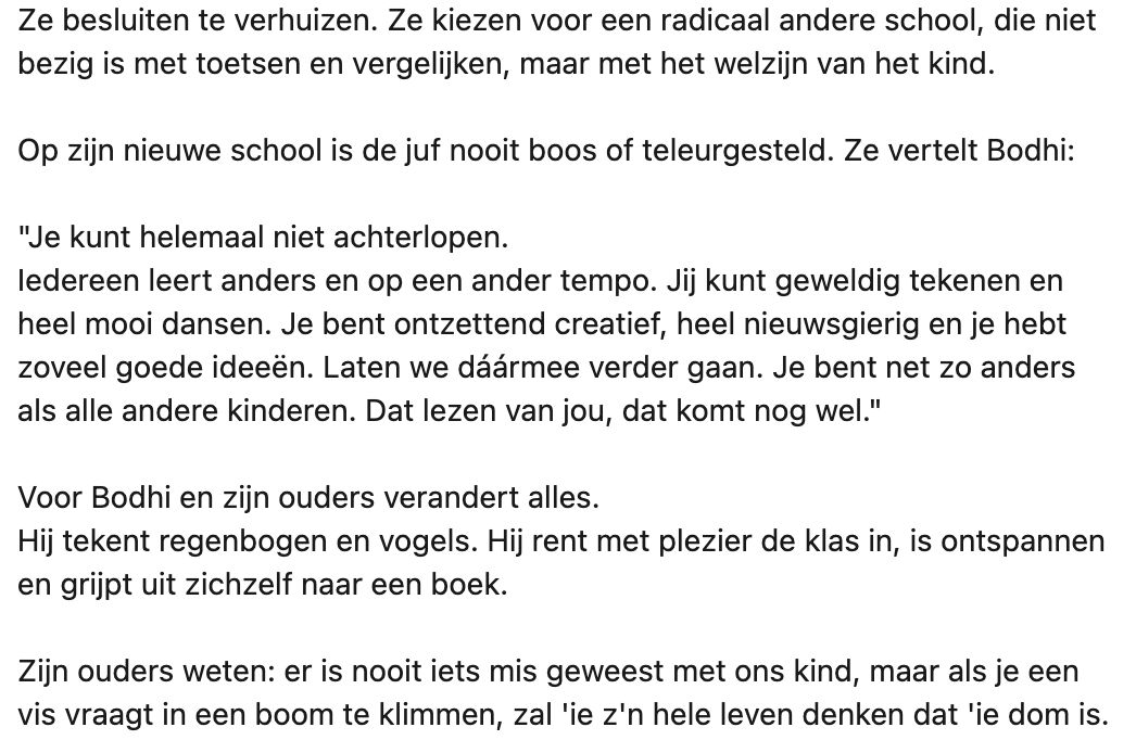 In Nederland zijn er verschillende soorten (basisschool)onderwijssystemen. Daarnaast worden veel onderwijssystemen steeds moderner. Er wordt tegenwoordig vaker gekeken naar het kind dan naar de leerprestaties. Maar er zijn ook nog veel scholen waarbij de focus wél voornamelijk ligt op de leerprestaties. Dat een leerling niet altijd een goede match is met een bepaald schoolsysteem is dan ook niet meer dan logisch. En die mismatch wordt helaas weleens gemaakt. Zo ook bij Bodhi en zijn ouders, die door een mismatch in het onderwijs niet op hun plek zaten. Arjan deelde het verhaal over kind Bodhi en zijn ouders,  en hun strijd in het onderwijs.