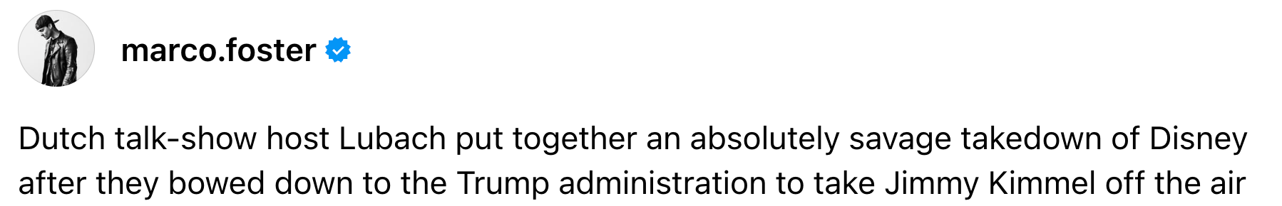Vorige week werd het programma van de Amerikaanse presentator Jimmy Kimmel voor onbepaalde tijd van de tv gehaald door Disney, de eigenaar van zender ABC. Ook Donald Trump dreigde met maatregelen. Kimmel had opmerkingen gemaakt over Charlie Kirk, die volgens de zender slecht getimed en ongevoelig waren. Arjen Lubach haakt in op deze ‘verbanning’, en zijn video heeft zelfs de Verenigde Staten bereikt. Zijn video bereikt zelfs de Verenigde Staten, waar Amerikanen zich rot lachen.