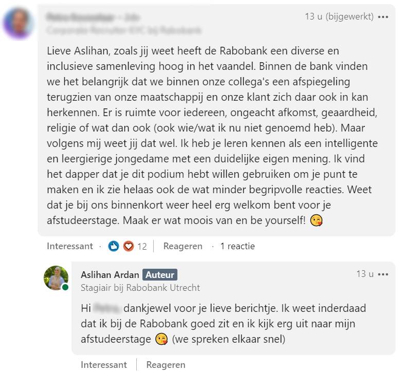 12. En een recruiter van Rabobank, waar Aslihan werkt, laat weten dat Aslihan ook op haar werk de vrijheid heeft om zich te uiten zoals zij wil. Want waar het echt om draait, is dat Aslihan gewoon knettergoed is in wat ze doet!
