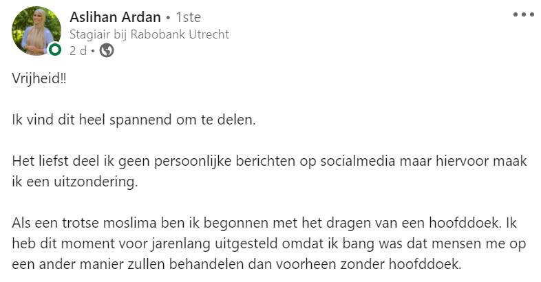 Vrijheid betekent voor iedereen iets anders. Voor Aslihan betekent het dat zij vrije keuzes kan maken binnen haar werk en binnen haar geloof. Sinds ze een hoofddoek draagt, voelt ze zich dan ook vrijer dan ooit. Op LinkedIn deelt ze haar bijzondere verhaal en dat maakt veel reacties los.