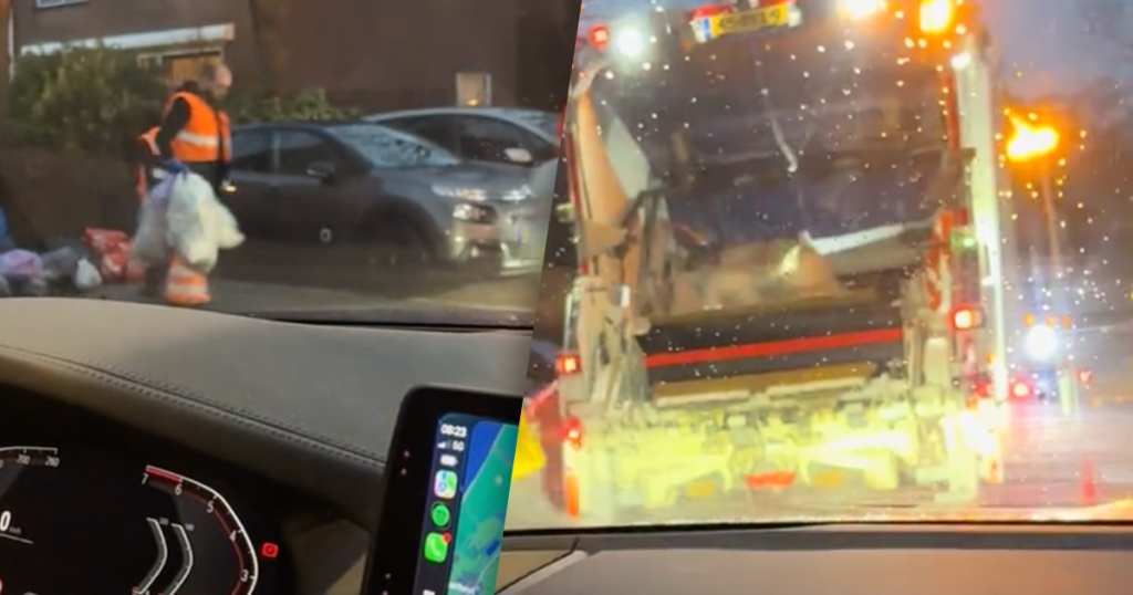 Automobilist staat stil achter vuilniswagen en neemt...