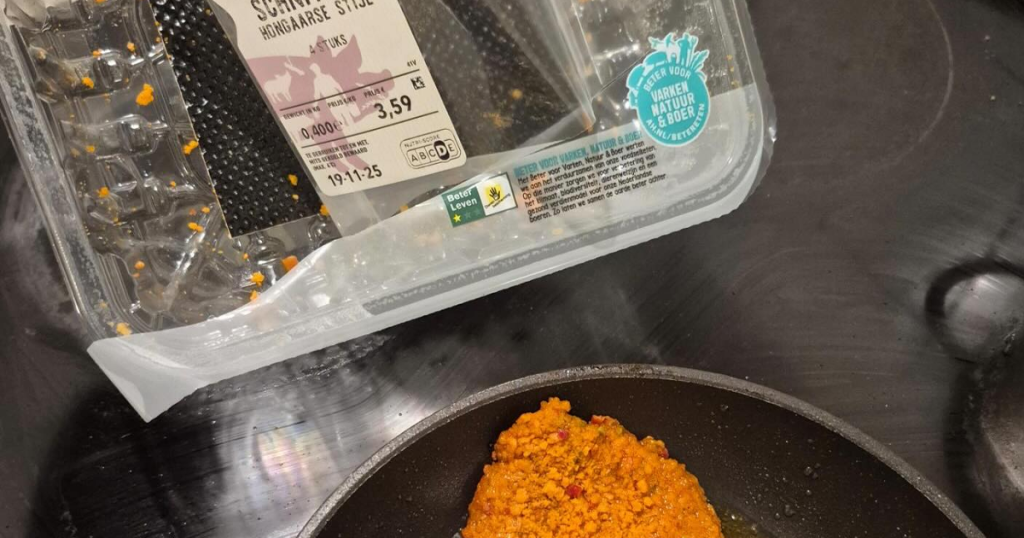 Klant legt schnitzel van Albert Heijn in pan en schr...