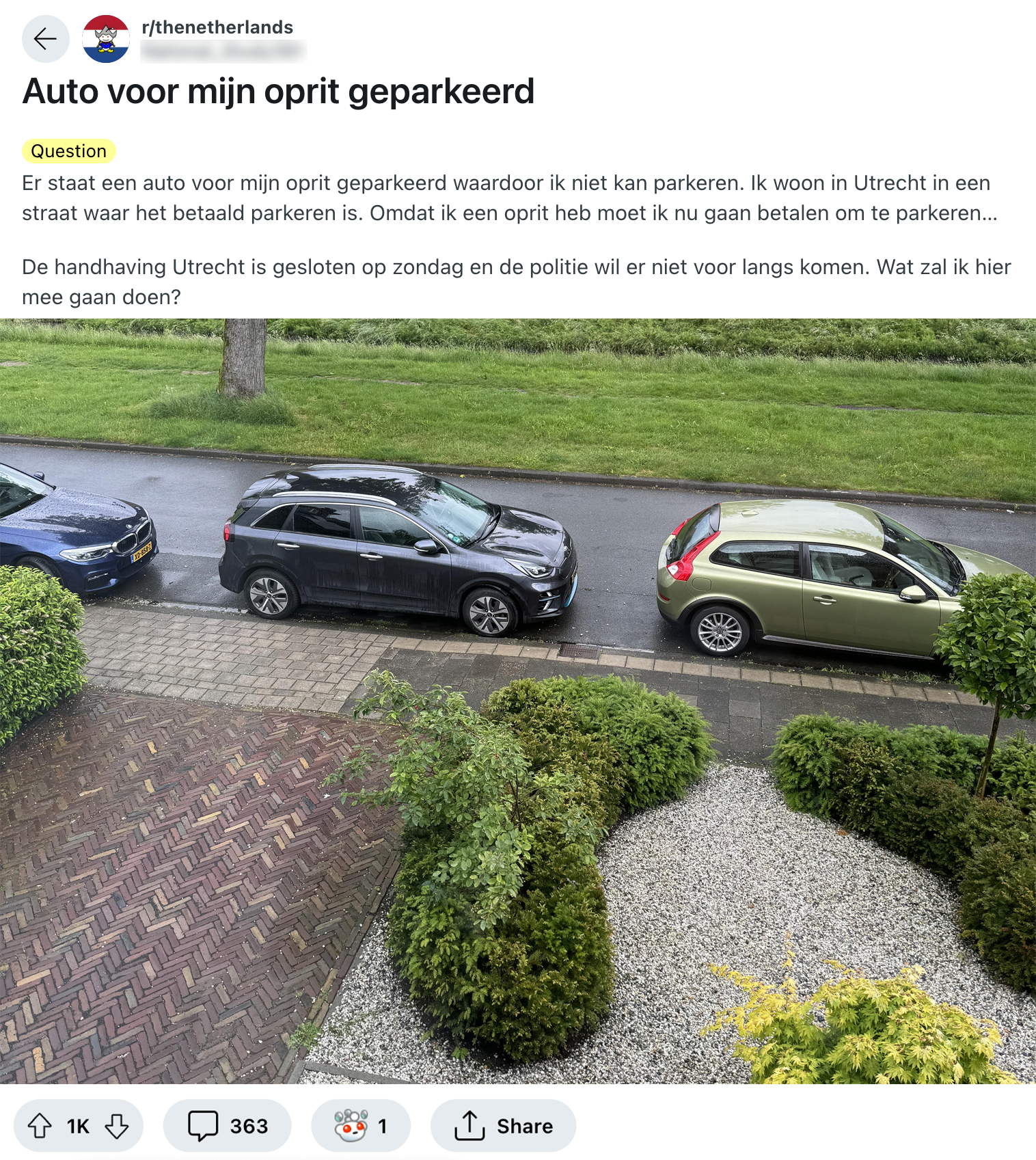 Dat niet elke Nederlanders een groot talent heeft voor parkeren, is wel duidelijk. Marcel z’n Fiat Panda tijdens het inparkeren net iets te hard tegen een paaltje en Riet verspreidt haar Mercedes gewoon lekker over een vak of vier. Toch heeft een automobilist in een woonwijk in Utrecht het voor elkaar gekregen om deze trap flink te overtreffen. De foutparkeerder heeft diens auto namelijk precies voor de oprit van een Reddit-gebruiker geplaatst. Uiteraard schiet Reddit te hulp, maar of je aan de adviezen ook echt wat hebt, is een tweede.