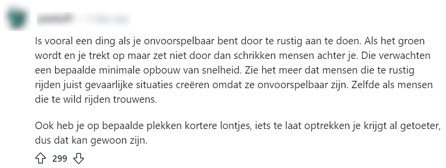 2. Een reddit-gebruiker vindt rustig rijden gevaarlijk, omdat het onvoorspelbare situaties creëert voor andere bestuurders.