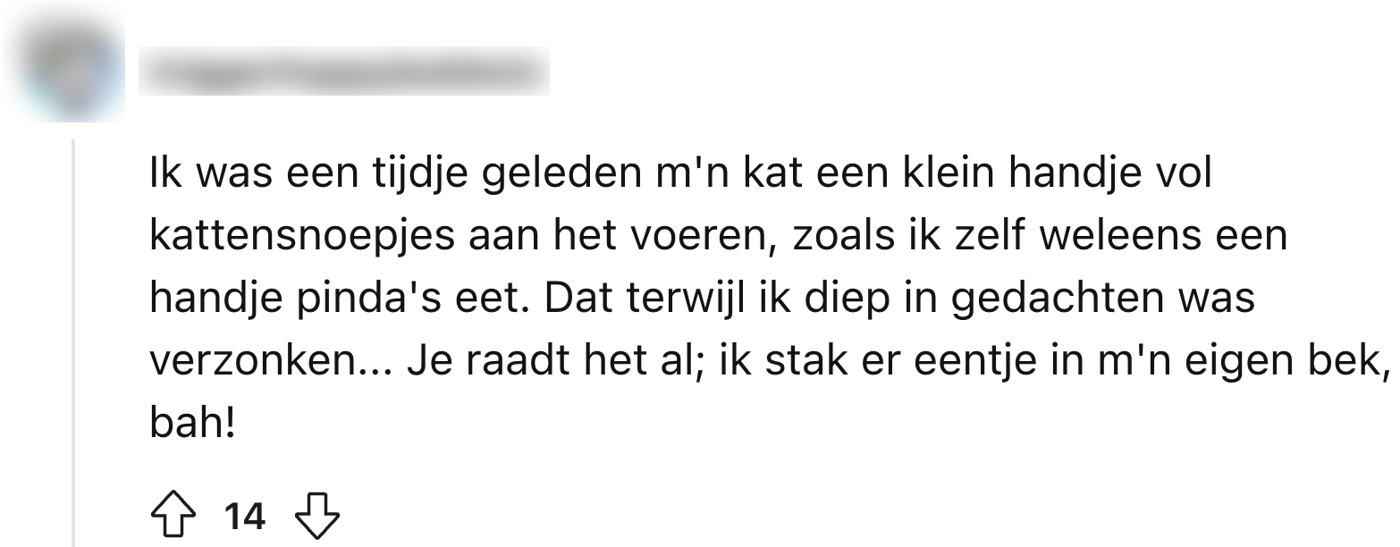 18. Helaas pindakaas. Uh, kattenvoer.