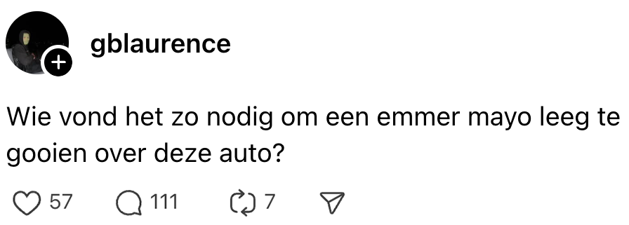 1. Een met mayo besmeurde auto… dat zie je niet elke dag.