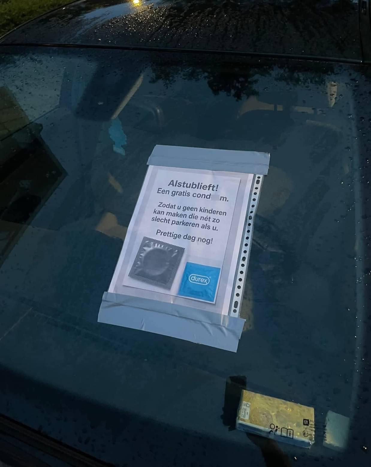 Sommige automobilisten lijken hun rijbewijs echt bij een pakje boter gekregen te hebben. Zo zou je denken dat het niet moeilijk is om in het vak te parkeren, in plaats van op de straat, of om tijdens het inparkeren niet alle spiegels van de auto naast je mee te nemen. Deze automobilist heeft er tijdens het inparkeren echter zó’n potje van gemaakt, dat voorbijgangers een briefje op de auto hebben achtergelaten. Eén ding is zeker: dit voertuig kan wel wat extra bescherming gebruiken.