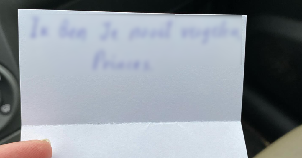 Als je na een lange, vermoeiende dag weer bij je auto aankomt, izit je niet te wachten op een witte, in de wind wapperende oorkonde met een dreigende boodschap erop. Met knikkende knieën en zweethandjes kijk je al of er schade is, of dat je misschien verkeerd geparkeerd hebt. Maar er kan ook een andere reden zijn dat er een papiertje onder je ruitenwissers is geklemd. Zo vindt déze automobilist een briefje met een nogal bijzondere boodschap op haar auto, waar ze toch een beetje bang van wordt.