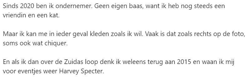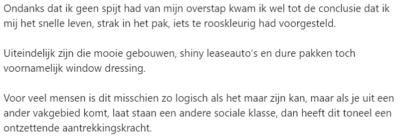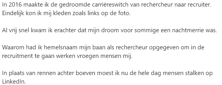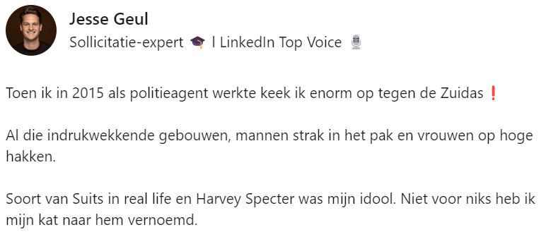 Jesse werkt als recruiter en doet dit met veel plezier. Jaren geleden, toen hij nog als rechercheur bij de politie werkte, werd hij aangetrokken tot een Harvey Specter-achtig leven elke keer als hij langs de Zuidas kwam. Eenmaal hier aangekomen, bleek het toch niet allemaal zo mooi als het van een afstandje leek. Hij deelt zijn ervaring op LinkedIn.