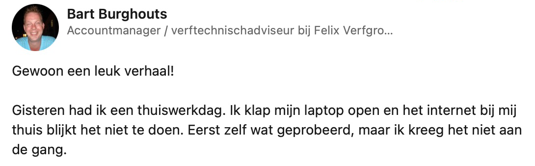 Thuiswerken met een instabiele of trage internetverbinding is verre van ideaal. Dat ondervond Bart aan den lijve toen zijn verbinding het regelmatig liet afweten. Vastbesloten om er iets aan te doen, nam hij contact op met zijn internetprovider, KPN, in de hoop dat zij het probleem konden oplossen. Tot zijn verbazing werd niet alleen zijn verbinding hersteld, maar kreeg hij na het telefoontje ook nog een aangename verrassing voorgeschoteld…