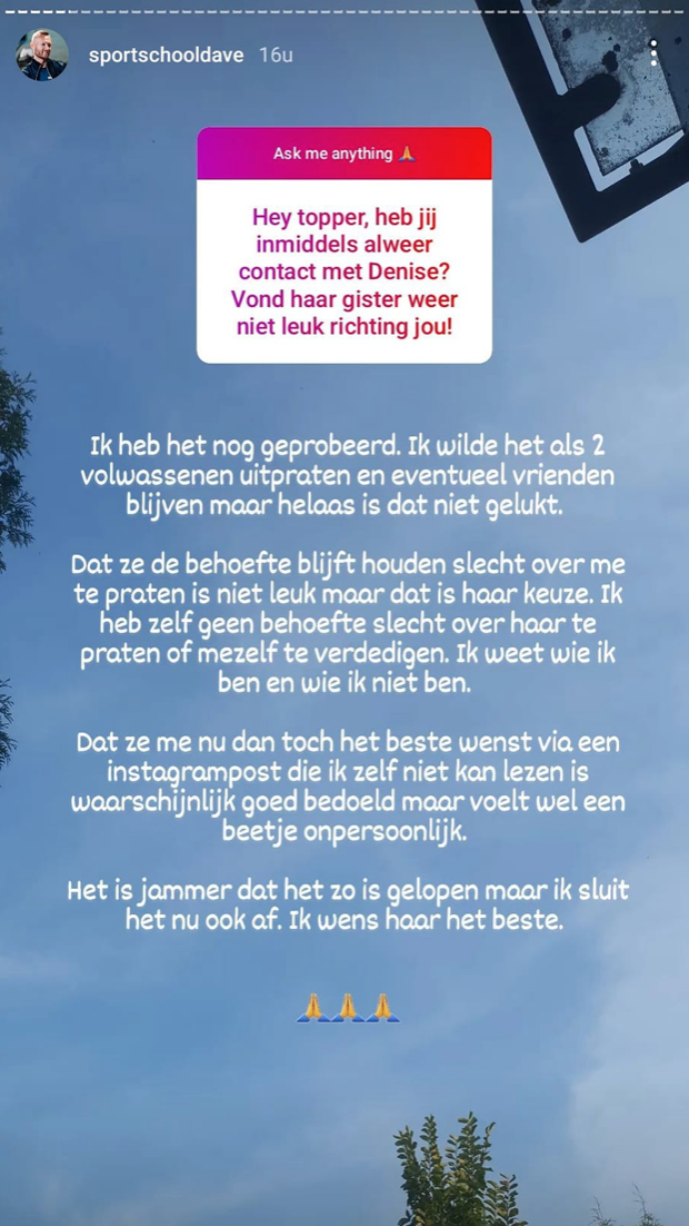 6. Dave en Denise hebben na hun afscheid in Spanje geen contact meer gehad. Maar Dave gaat gewoon lekker door met z’n leven.