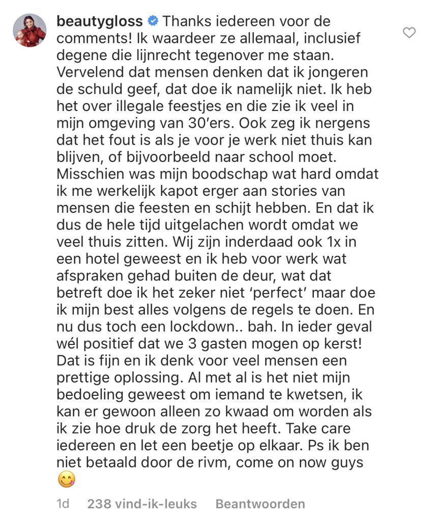 Het hele jaar delen mensen al massaal hun meningen over alles rondom corona op social media. En de laatste tijd wordt dat alleen maar meer. Veel mensen uiten hun frustraties over mensen die zich niet aan de regels houden, en anderen vinden die regels juist onzin. Ook YouTuber Mascha, ook wel bekend als Beautygloss, deelt haar boosheid op Instagram, en richt die vooral naar alle mensen die feestjes hebben gevierd. Veel mensen staan achter haar, maar ze krijgt ook ontzettend veel kritiek op haar bericht.
