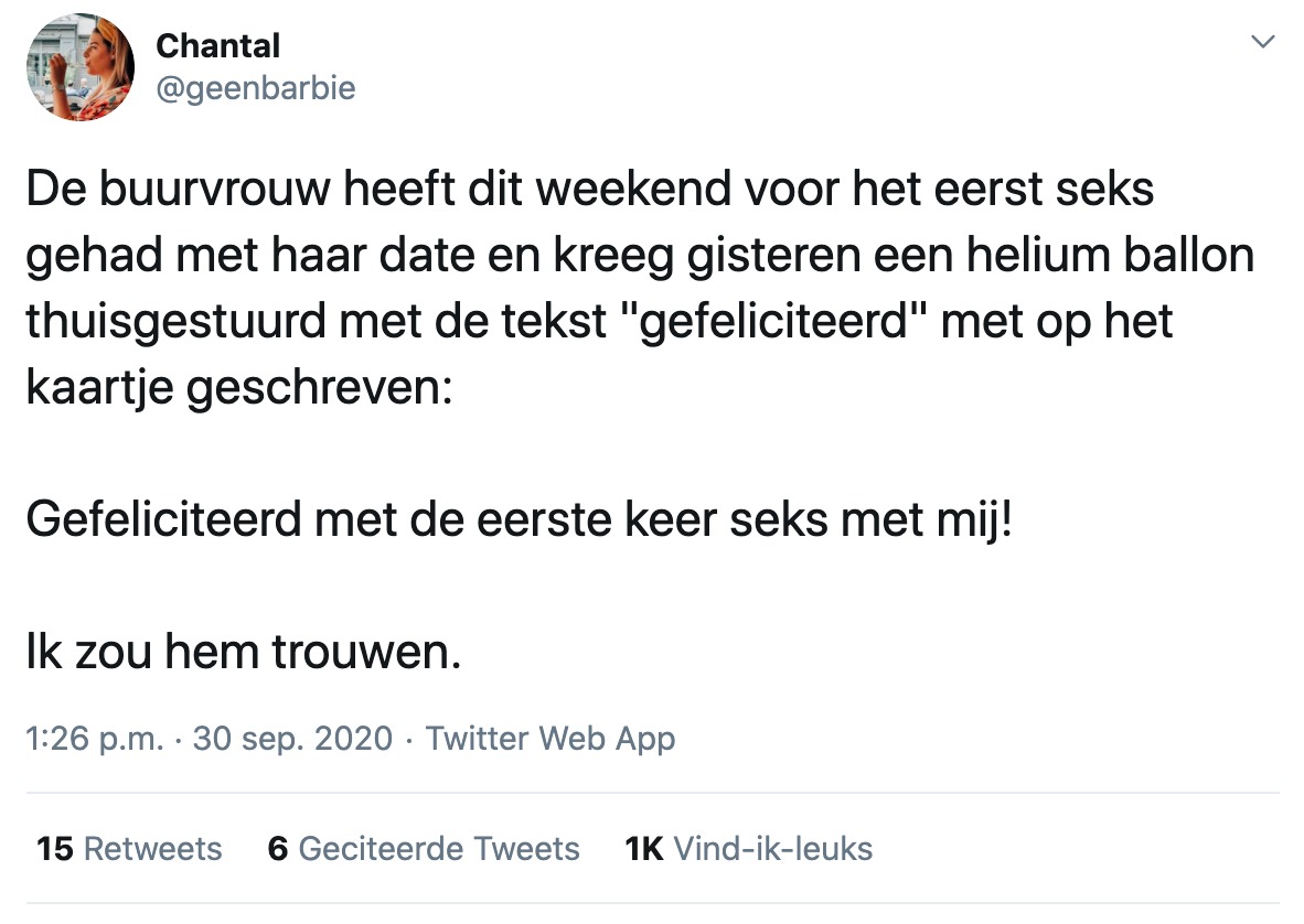Een bosje bloemen als je één jaar een relatie hebt, een doosje bonbons met Valentijnsdag of een lief kaartje met je verjaardag. Allemaal hartstikke lief en veelvoorkomend. Maar een paar maanden terug kwamen we op een Tweet van @geenbarbie, wie laat zien dat het ook anders kan.