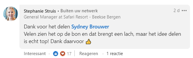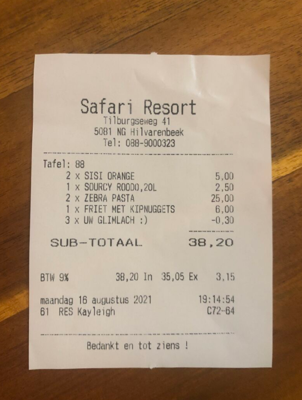 Een dagje dierentuin kan soms best vermoeiend zijn. Na een aantal uren rondstruinen gaat er best wat lekkers in. Safari park Beekse Bergen verrast hun klanten met een leuke boodschap op het bonnetje van hun restaurant. En zo kan een simpel bonnetje belachelijk viral gaan op LinkedIn.
