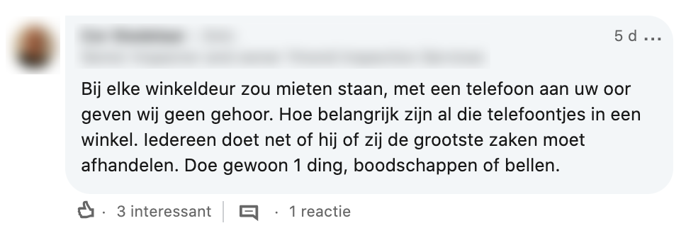 Telefoneren als je in een winkel bent. Kan dat wel of kan dat niet? Als het aan sommige winkels ligt, is het not done. En als je dan op je strepen wilt staan, zet je gewoon een bordje neer om duidelijk te maken dat bellen in de winkel hier niét wordt toegestaan als je geholpen wilt worden door het personeel. We schreven er een tijdje terug een blog over.