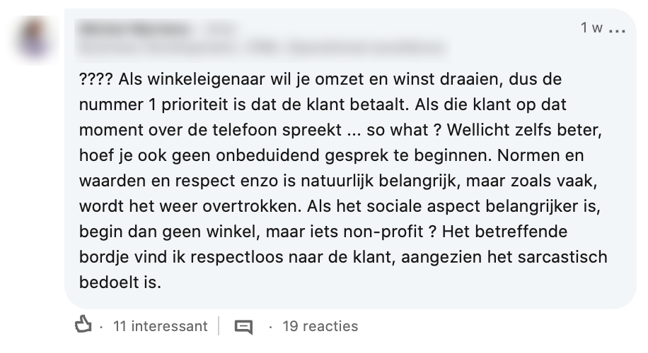 Telefoneren als je in een winkel bent. Kan dat wel of kan dat niet? Als het aan sommige winkels ligt, is het not done. En als je dan op je strepen wilt staan, zet je gewoon een bordje neer om duidelijk te maken dat bellen in de winkel hier niét wordt toegestaan als je geholpen wilt worden door het personeel. We schreven er een tijdje terug een blog over.