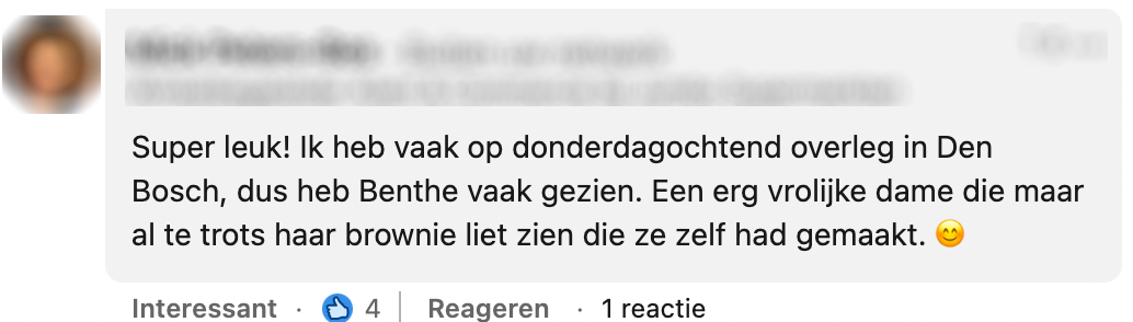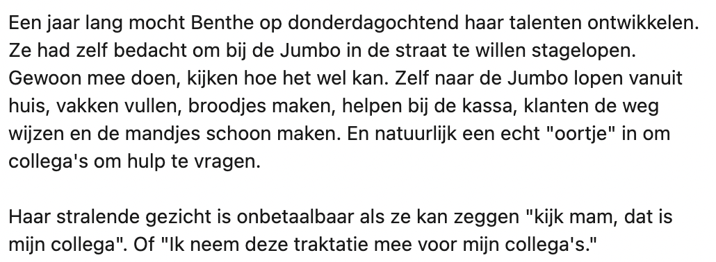 De dochter van Barbara, Benthe, heeft haar VSO-stage bij de Jumbo succesvol afgesloten. Dat is sowieso knap en al helemaal omdat Benthe het downsyndroom heeft. Vol trots zwaait Benthe haar collega’s uit op haar laatste dag. Het is heel belangrijk dat iedereen kan meedoen in de maatschappij. Barbara plaatst op LinkedIn en doet een oproep aan bedrijven om meer mensen met het syndroom van down een kans te geven.