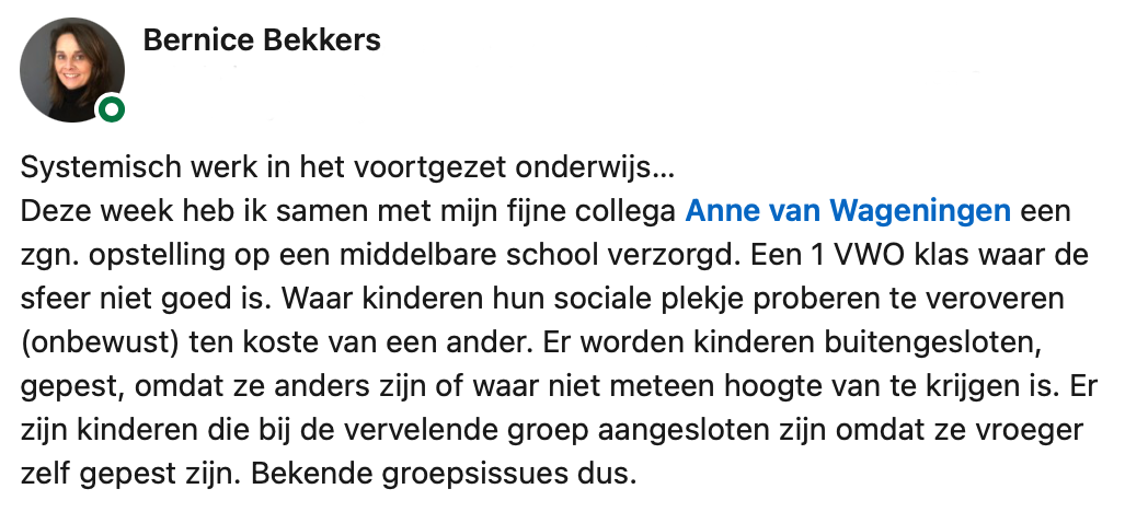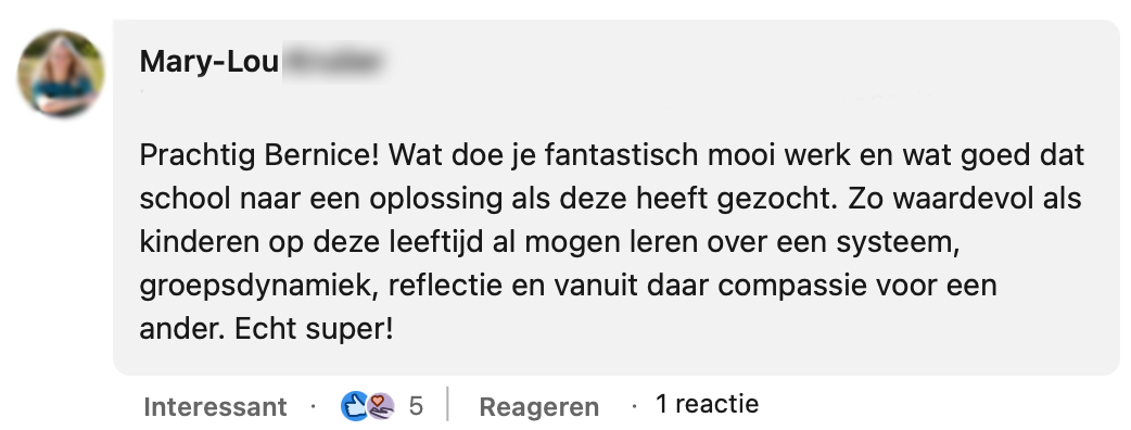Bernice Bekkers en haar collega Anne helpen jongeren en volwassenen om meer zelfvertrouwen te krijgen. Daarmee hopen ze dat mensen bijvoorbeeld met meer plezier naar kantoor of school gaan. Het is algemeen bekend dat de band die je voelt met je collega of klasgenoten namelijk een flinke invloed heeft op hoe jij je school of werk ervaart. Op LinkedIn deelt Bernice dat ze langsging bij een brugklas op het Wolfert Lyceum in Bergschenhoek. Er hing geen fijne sfeer in de klas, maar gelukkig wist zij precies wat ze daar aan kon doen. Ze ging samen met de leerlingen aan de slag…