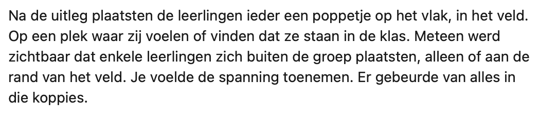 2. De leerlingen krijgen de opdracht om allemaal een poppetje op een veld te zetten: dit om in beeld te brengen hoe alle leerlingen zich tot elkaar verhouden.
