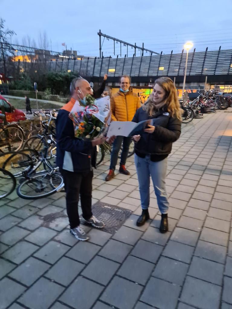 Leonoor: “Iedereen wilde er natuurlijk bij zijn maar dat kan niet vanwege corona en ook met handhaving wordt dit lastig. Uiteindelijk stonden wij met 5-6 mensen beneden te wachten. Er was een bloemetje gekocht en een kaartje en er was een cheque gemaakt. Toen hebben we vanaf kwart over zeven vanochtend staan wachten op hem omdat hij altijd tussen half acht en acht uur langs komt. Uiteindelijk hebben wij een uurtje staan wachten en hebben we hem even meegenomen en hem daarmee verrast en volgens mij was hij er heel erg blij mee!”