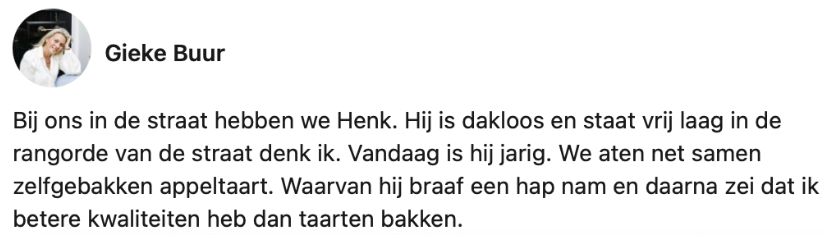 5. We mogen het verhaal van Gieke en haar dakloze buurman Henk ook niet vergeten.