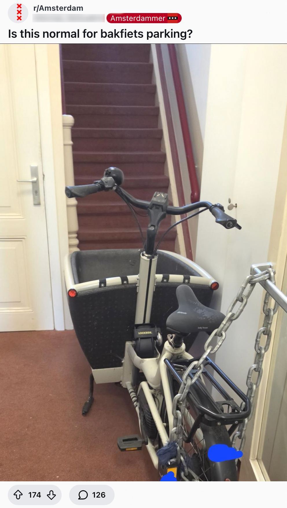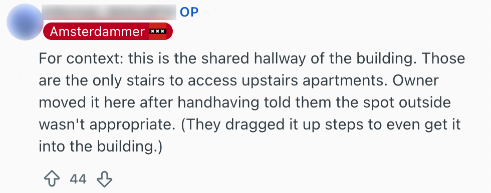 Aangezien je voor een langere tijd naast ze woont, is het wel zo fijn als je het goed kunt vinden met je buren. Maar in dit geval is dat knap lastig. Een bewoner heeft namelijk nogal last van de bakfiets van de buren die pal voor een trap geparkeerd staat en vraagt zich af of dat normaal is. Als je de reacties op Reddit leest, wordt het antwoord al snel duidelijk: nee.