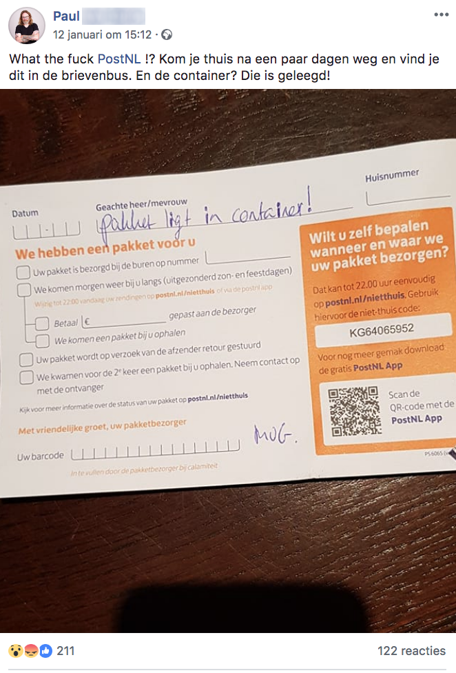 We bestellen erop los tegenwoordig en daarmee gaat er dus ook wel eens wat mis. En dus blikken we terug op dit verhaal van Paul. Want dat PostNL bezorgers erg creatief kunnen zijn weten we al langer dankzij social media en bijvoorbeeld Facebookpagina We hebben u gemist. Bij Paul was het ook raak. En daar maakt hij graag even wat woorden vuil(nis) aan…