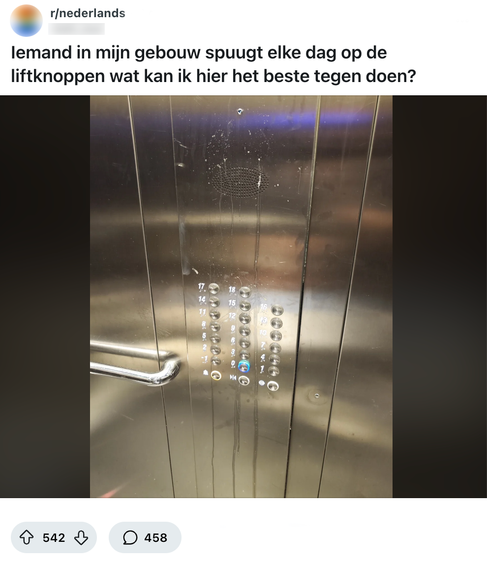 Het is bijna logisch dat je je huis goed schoon houdt, want je wilt natuurlijk niet tussen de schimmel of ongedierte wonen. Naast dat je zelf erg je best doet, hoop je dat je buren ook hun handen uit de mouwen steken. Het is namelijk wel zo fijn dat je niet over vuilniszakken struikelt zodra je een voet buiten de deur zet. Toch blijkt het niet voor iedereen zo vanzelfsprekend. Iemand spuugt constant op de knoppen van een lift in een appartementencomplex, en een bewoner vraagt online om hulp. De reacties zijn alleen nét wat minder praktisch dan gehoopt.