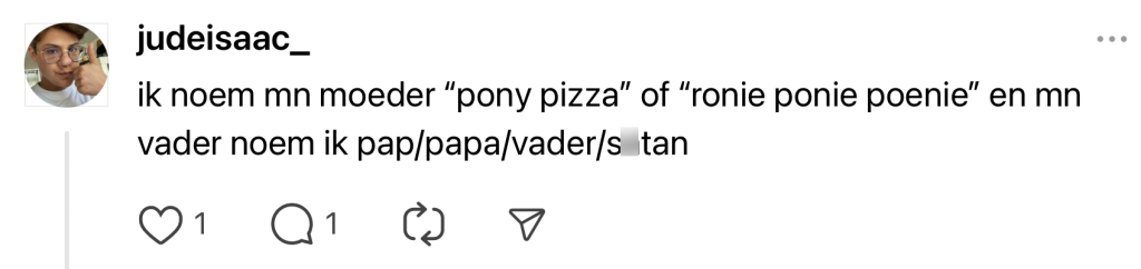 Kinderen staan er misschien om bekend dat ze niet luisteren, maar het kan ook nog weleens lastig zijn om die ouders van je te bereiken. Niet alleen door het volume waarmee je soms moet schreeuwen, maar ook door de manier waarop je ze aanspreekt. Of je ze nu mama, papa, moeder, vader of ‘hey, vuile natnek’ noemt: iedereen heeft zo z’n eigen manier om hun aandacht te vangen. Zoë vraagt op Threads hoe mensen hun verwekkers noemen en krijgt een hoop bijzondere antwoorden.