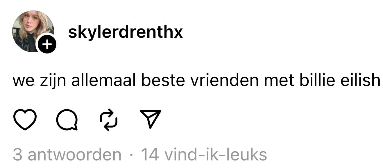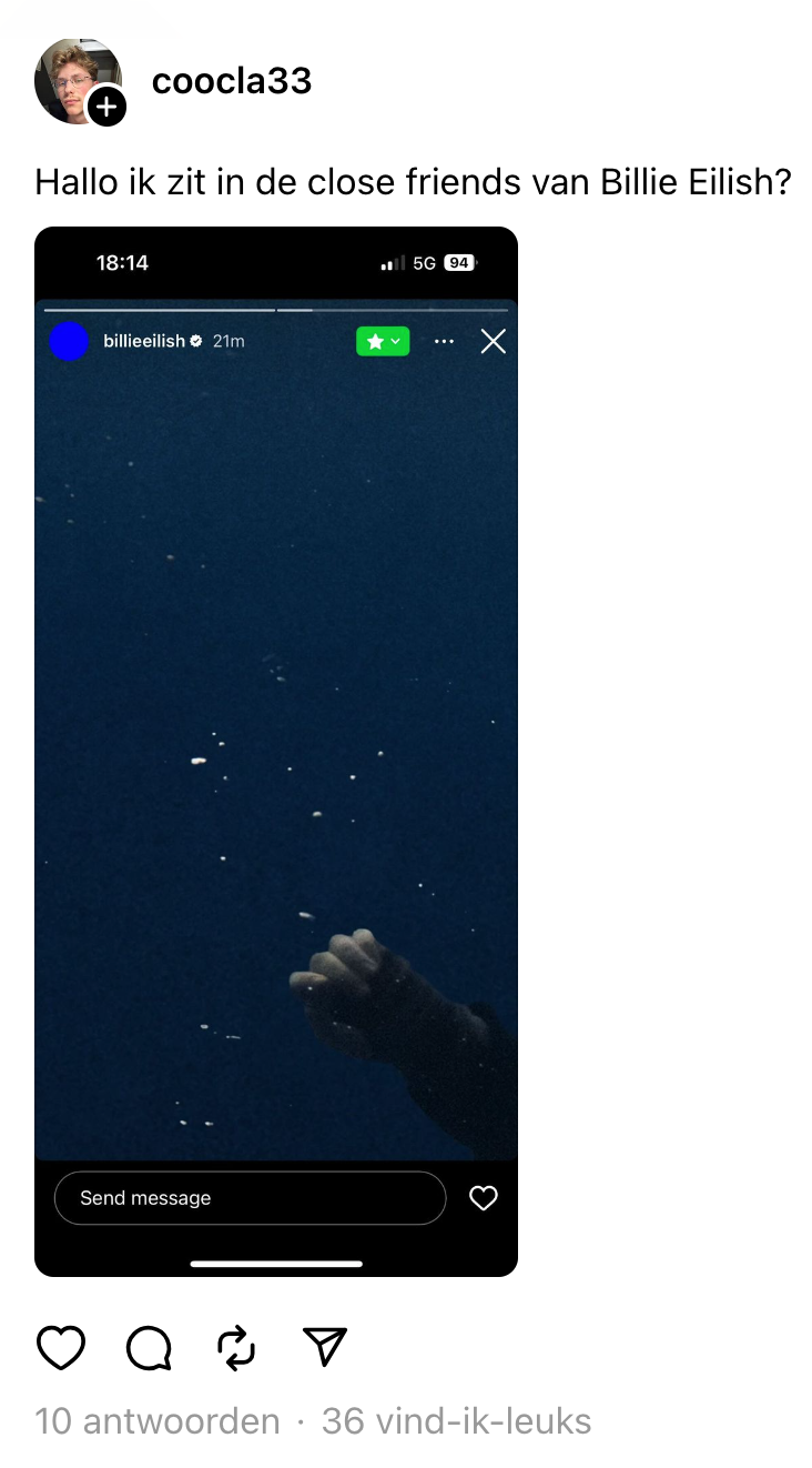 Wie er vroeger niet van heeft gedroomd om allerbeste vrienden met hun idool te zijn, is misschien niet helemaal goed in z’n hoofd. Voor sommige Nederlanders die deze droom wel bezitten, blijkt dat nu werkelijkheid te worden. Op Instagram kan je namelijk een ‘beste vriendenlijst’ samenstellen, zodat alleen bepaalde mensen jouw berichten of Stories kunnen checken. En wat blijkt? Een hoop Nederlanders zijn op de lijst van de enige echte Billie Eilish te zijn beland. Waar de Amerikaanse beroemdheid normaal al mensen in complete extase brengt, staat door deze actie het hele internet op z’n kop.