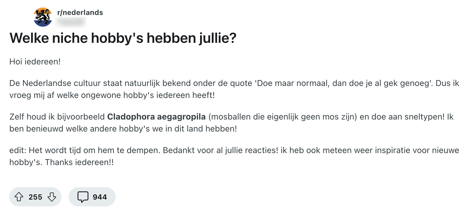 1. Deze redditor vraagt zich af wat voor bizarre hobby’s andere Nederlanders hebben.
