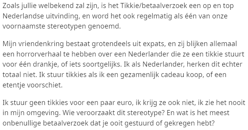 Als wij Nederlanders érgens om bekendstaan, zijn het onze gierige Tikkies wel. Al zit niet iedereen in een bubbel van krenterige betaalverzoeken, zo ook de volgende Reddit-gebruiker. Hij vroeg zich af wie zich hier schuldig aan maakt en hoe dit stereotype nou eigenlijk wordt veroorzaakt. En hij kreeg vanuit alle kanten antwoord.