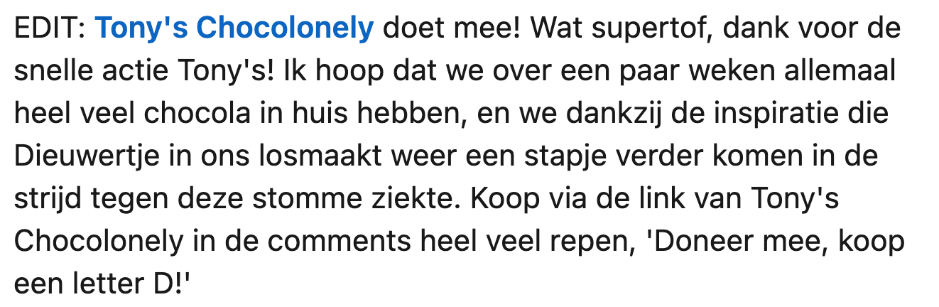 2. Tony’s Chocolonely ziet dit wel zitten en brengt de chocoladeletter ‘D’ terug, speciaal voor Dieuwertje.