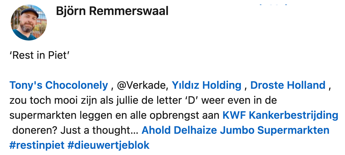 Afgelopen maandag stonden Nederlanders massaal stil bij het overlijden van het boegbeeld van het Sinterklaasjournaal, Dieuwertje Blok. Om haar te eren heeft illustrator Björn een bijzonder initiatief bedacht, dat tegelijkertijd een bijdrage levert aan KWF Kankerbestrijding. Hij klopt aan bij verschillende chocolademerken, waaronder Tony’s Chocolonely. Zij vinden het zo’n goed idee dat ze het daadwerkelijk gaan uitvoeren. Eén ding is zeker: het initiatief valt online flink in de smaak.